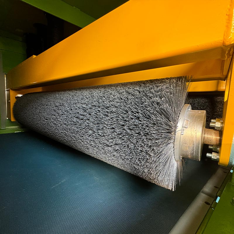 gummibanetransportørsystemet, der 8 sett med slipende børsteruller sekvensielt fullfører det grove og fine